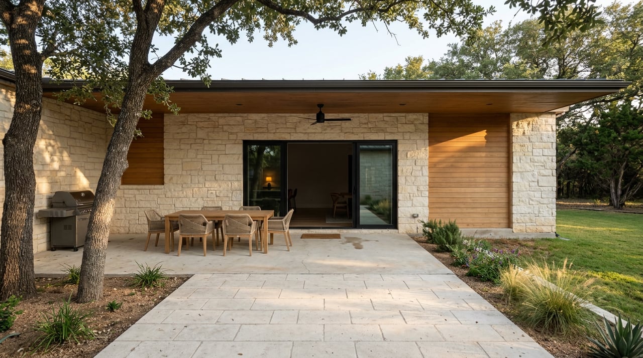 Native limestone is a Hill Country hallmark used for facades, chimneys, and site walls. It’s durable and looks right at home in Driftwood. Plan for occasional maintenance like repointing mortar and checking flashings after heavy weather.