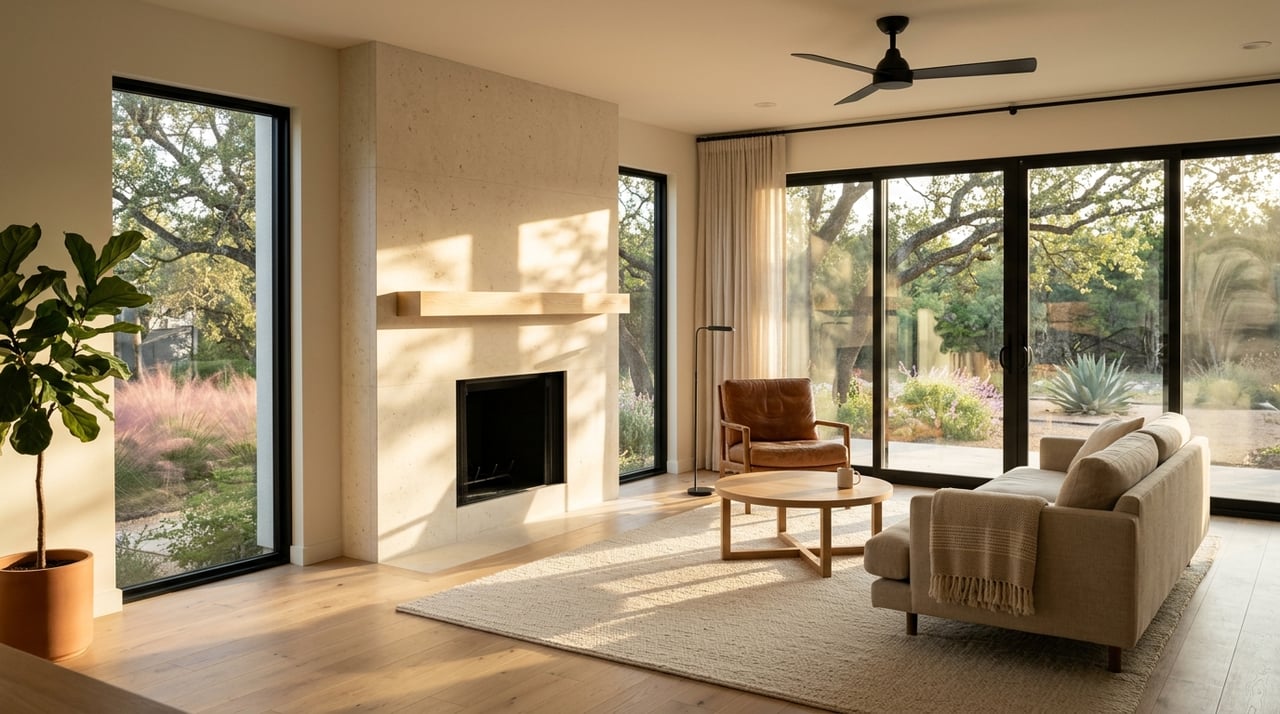 Black-framed windows and large sliding or folding doors support the modern Hill Country look. In Texas sun, high-performance low-E glass and the right solar heat gain ratings are important. Pair glazing with well-sized overhangs and porches to reduce glare and heat.